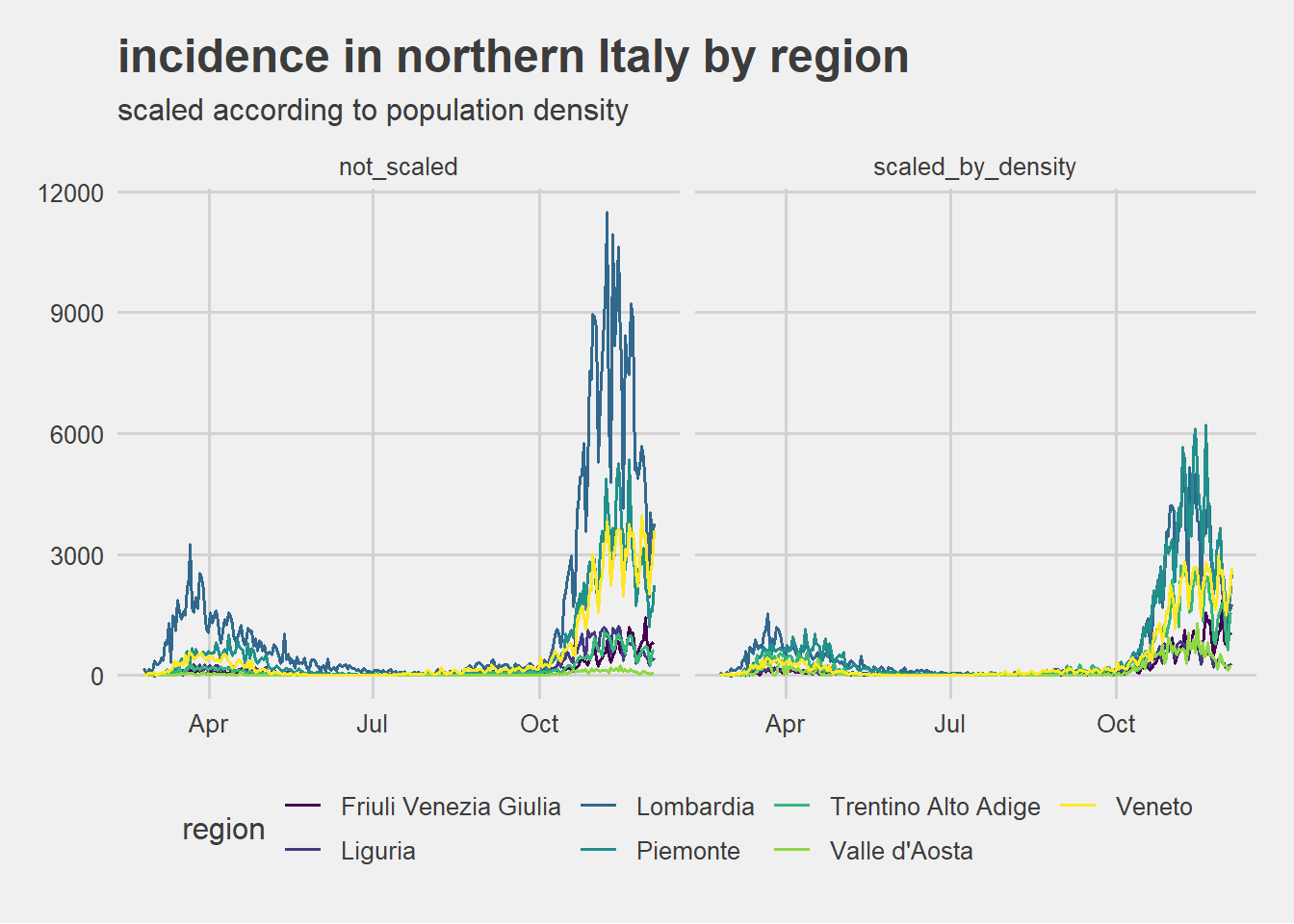 In order to verify if a relation exists between COVID incidence and population density, the incidence has been scaled according to relative population density. The idea is that if population density is the only factor driving the diffusion of COVID the epi curves should tend to stay in a narrower band at list when the epidemic has spread all over the country. The population density by regions has been scraped from tuttaitalia.it. The relative population density has been computed on the base of the average density for all Italy (199 inhabitants per squared kilometer) so that Lombardy having a density of 423 has a relative density of 423/199 or about 2.126.