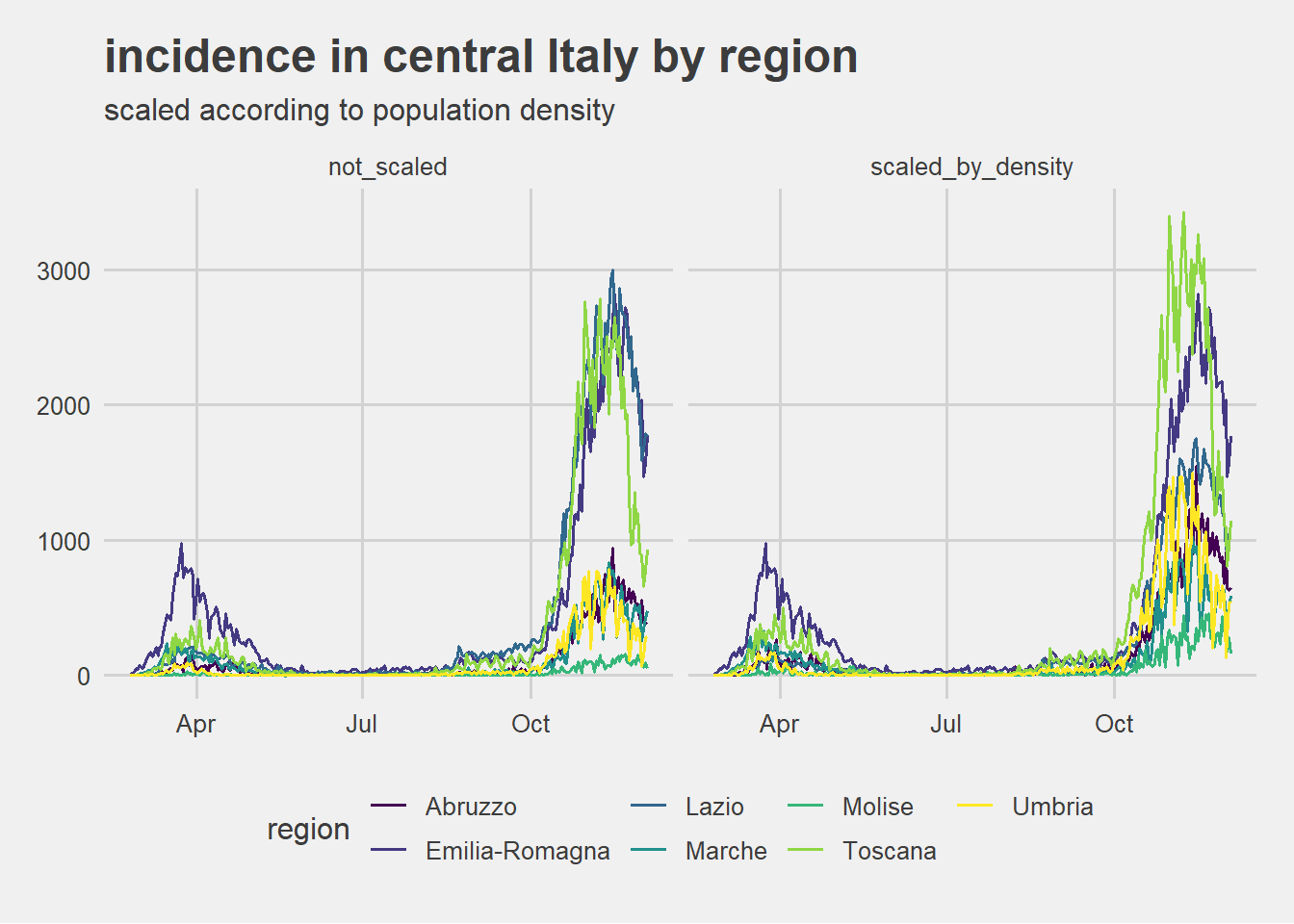 After scaling according to relative population density Lazio incidence seems to come closer to other regions incidence. Epi curves of Emilia-Romagna and of Tuscany instead are not pushed towards other central regions epi curves so that they can be visually considered as showing the same phenomenon intensity.