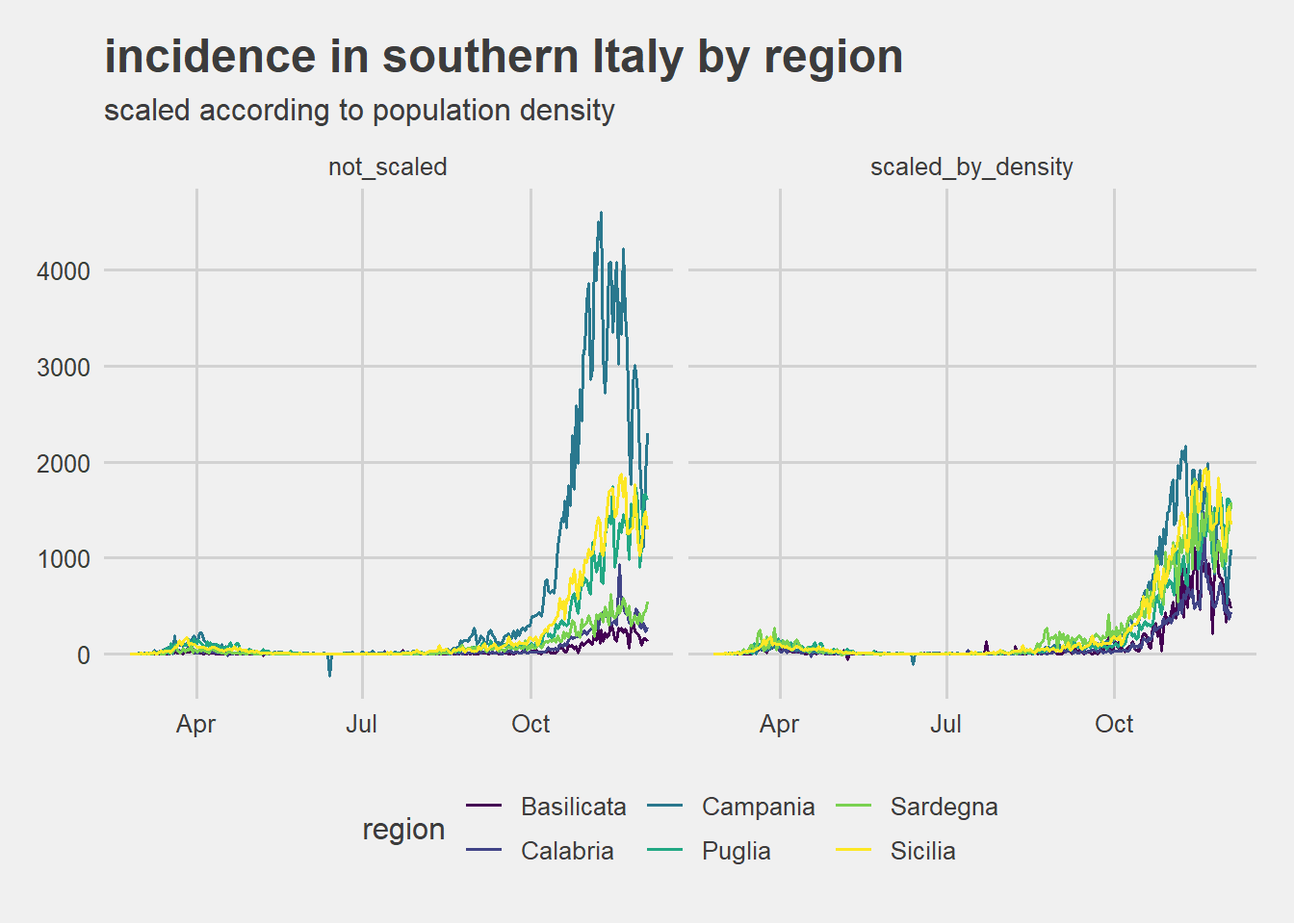 After scaling according to relative population density all southern regions seems to stay into a not so wide band. Only Campania highlights a relatively higher incidence.