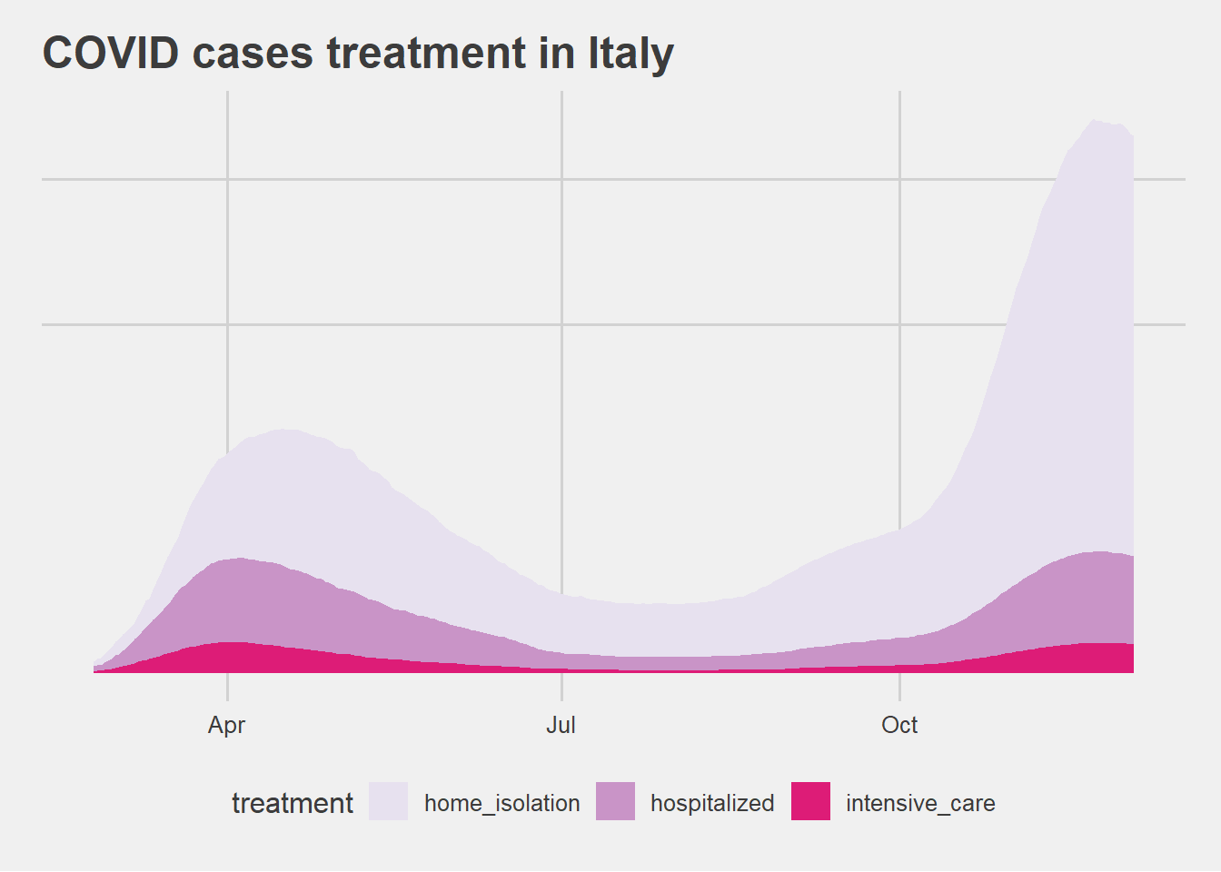The official data available specify the treatment modality for COVID cases. These are divided into three categories: hospitalized, intensive care and treated in isolation at home. The chart below shows the amount of cases undergoing the different treatments across the time from the pandemic outbreak through December 3. The amount of treated cases has been square root transformed in order to enable the visualization of cases treated in intensive care.