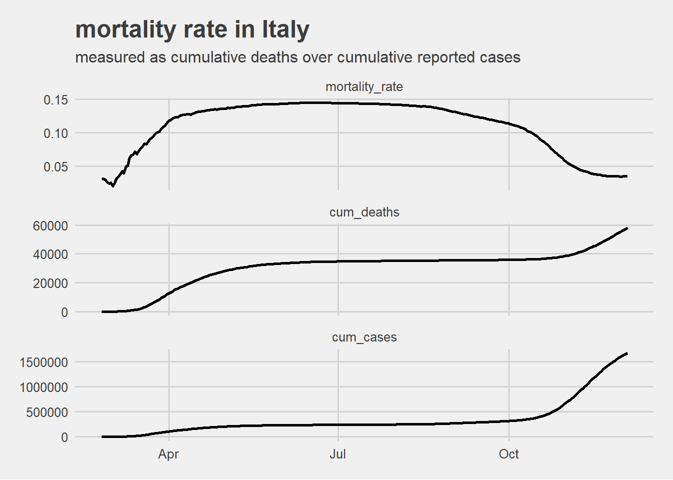 This visualization highlights that the drop in mortality rate between the first wave in spring and the second one in autumn is given mostly by the exponential rise of detected new cases at the denominator (due also to the increased screening capacity).