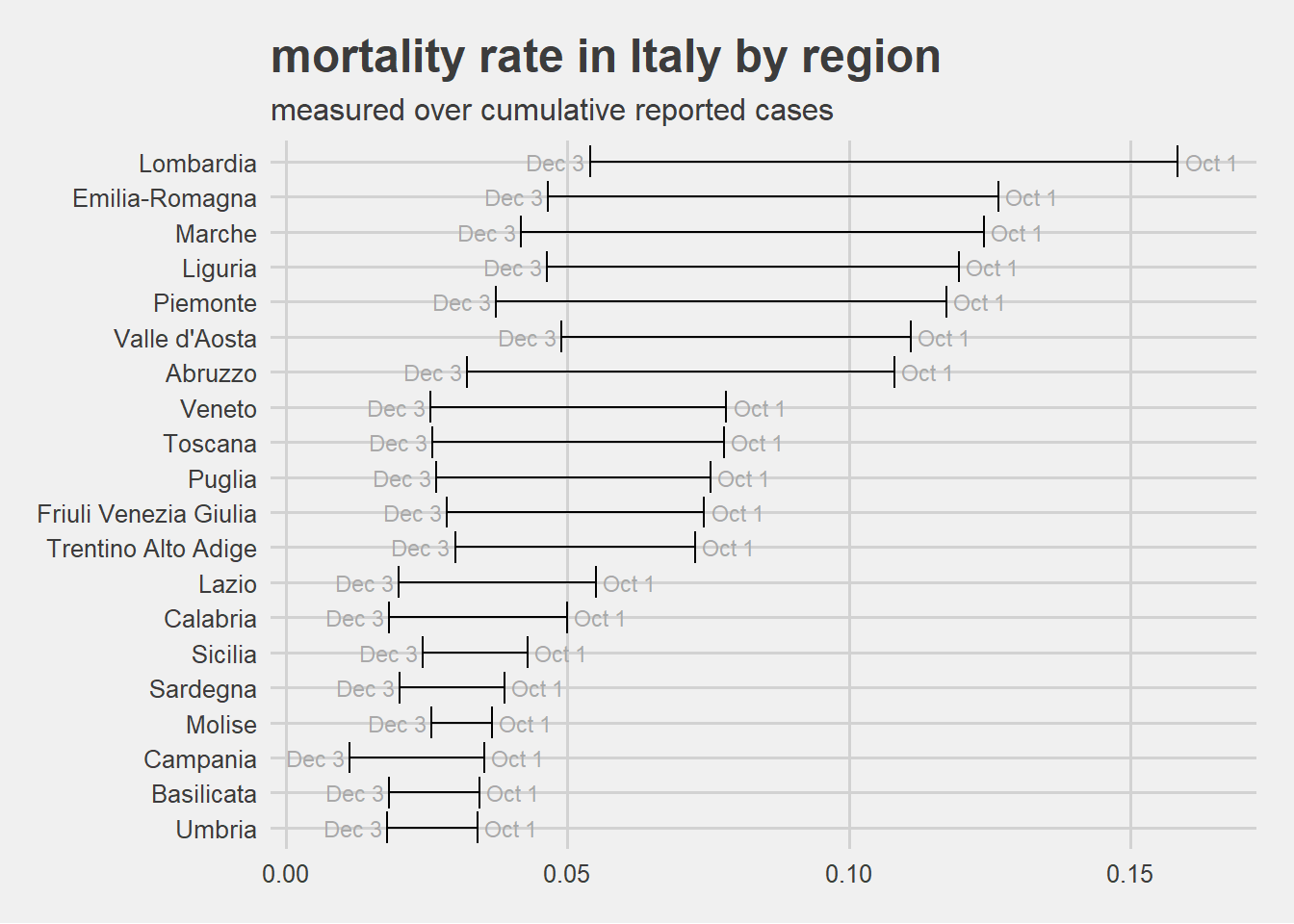 The following graph displaying the mortality rate range for each region considering only the data from October 1 to December 3 2020.