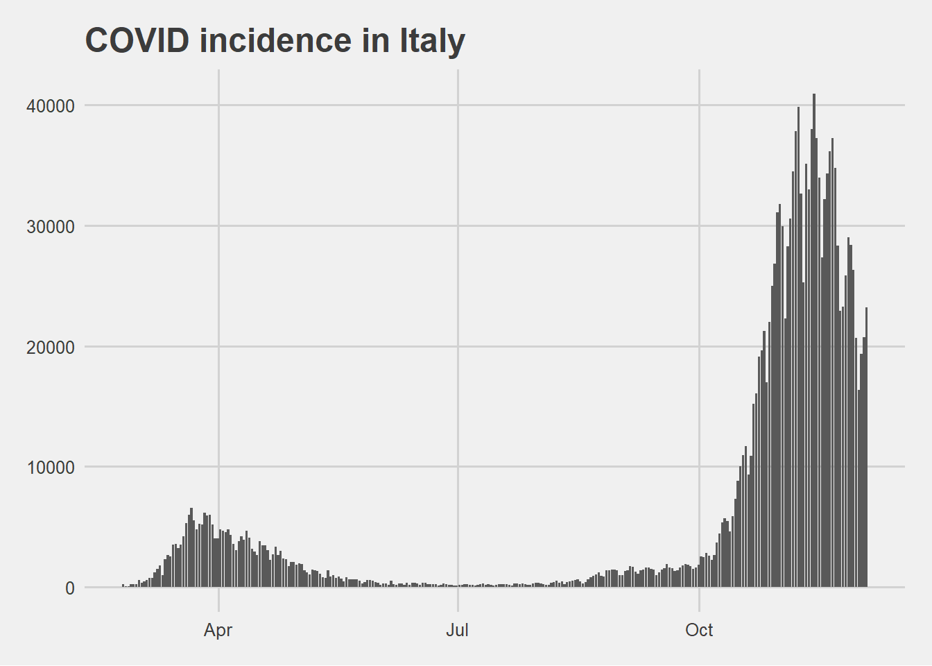 While in spring the most affected regions were situated in northern Italy with Lombardy hit the hardest, in autumn all Italy is affected with more region with high incidence.
