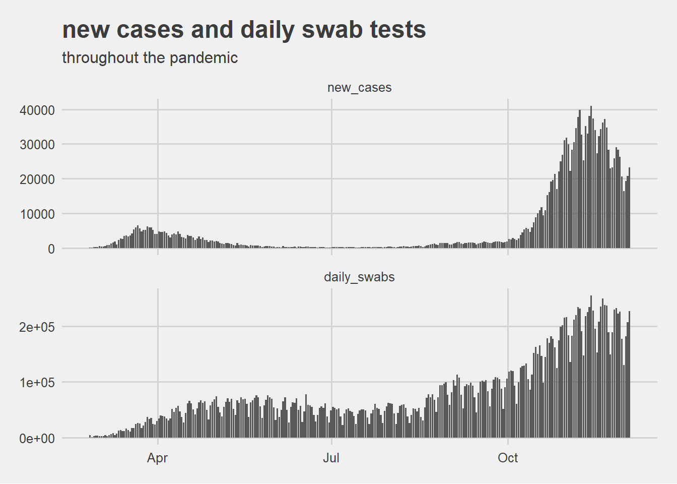 The epi curve above is based on daily reported new cases. This curve highlights a huge difference in number of new cases between the pandemic first wave in spring and the second wave in autumn.