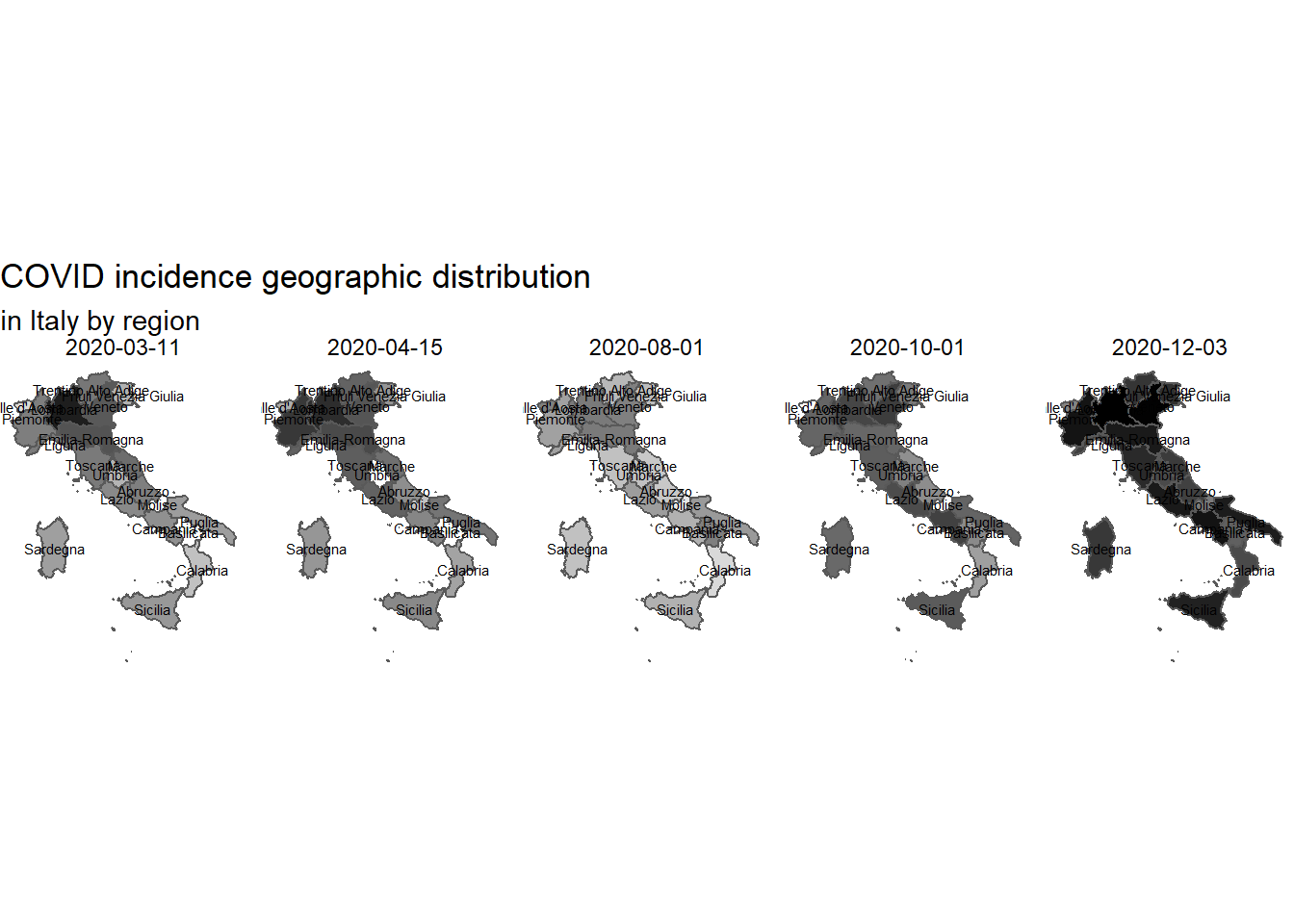 By analyzing a Italy by region through time, it is possible to verify that in the different phases of the pandemic the infection spread all over the country.