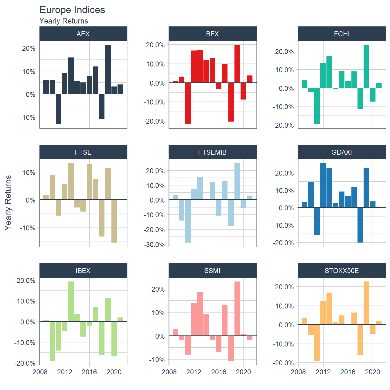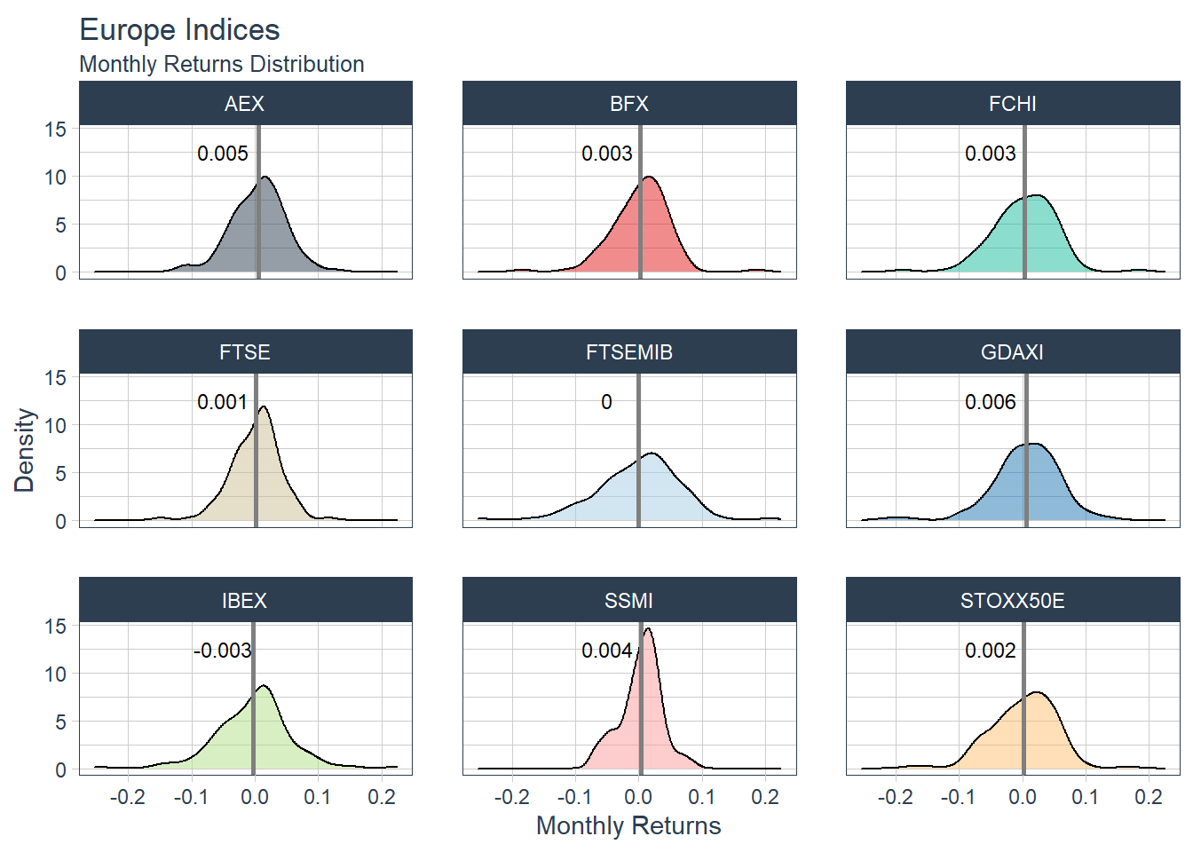 The indices showing the best mean returns are the ones of GDAXI (Germany) and AEX (Netherlands) with Germany slightly more volatile. The indices with the less dispersed (less risky) monthly returns are SSMI (Switzerland) and FTSE (UK). While IBEX (Spain) shows the worst mean monthly return, FTSEMIB (Italy) is the most volatile.