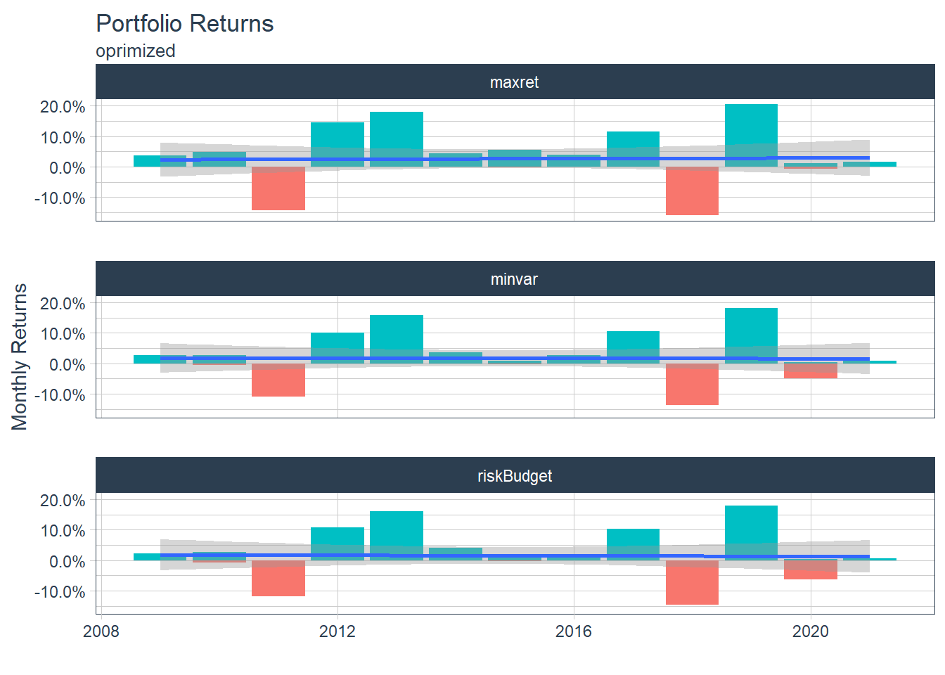 All 3 portfolios incurred in a strongly negative performance in 2011 and 2018 while only riskBudget portfolio showed a significative negative performance in 2020 and a negativity in 2010. It seems that allowing 30% of risk measured by ES did not defend from experiencing bad performance years and did not allow to get the most from positive performance years.