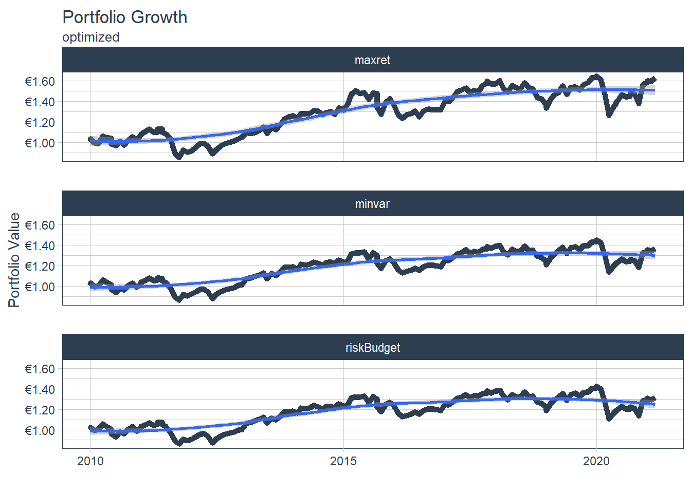 Considering the portfolio growths plotted above with the 3 optimized portfolios if 1 euro was invested in late 2009 now the investor reached a portfolio value of: