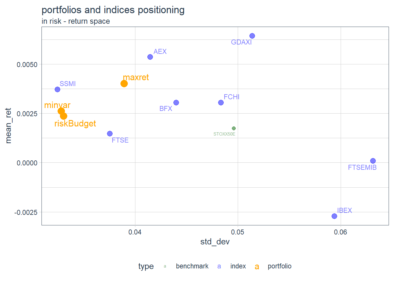 In this post all the final considerations are delegated to the following data visualization which displays the 3 optimized portfolios together with the European indices considered in the risk - return space.