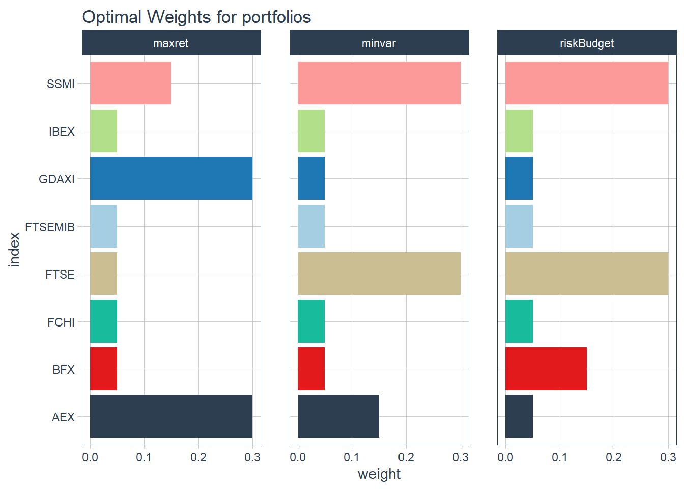 The 3 portfolio of European indices optimized for maximum return, minimum variance and ES risk budget have the index weights visualized below.