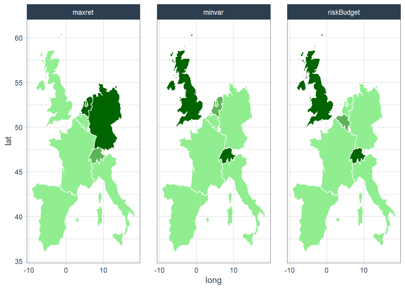 In order to facilitate understanding of the optimal portfolio weights, the weights themselves are visualized in a choropleth map.