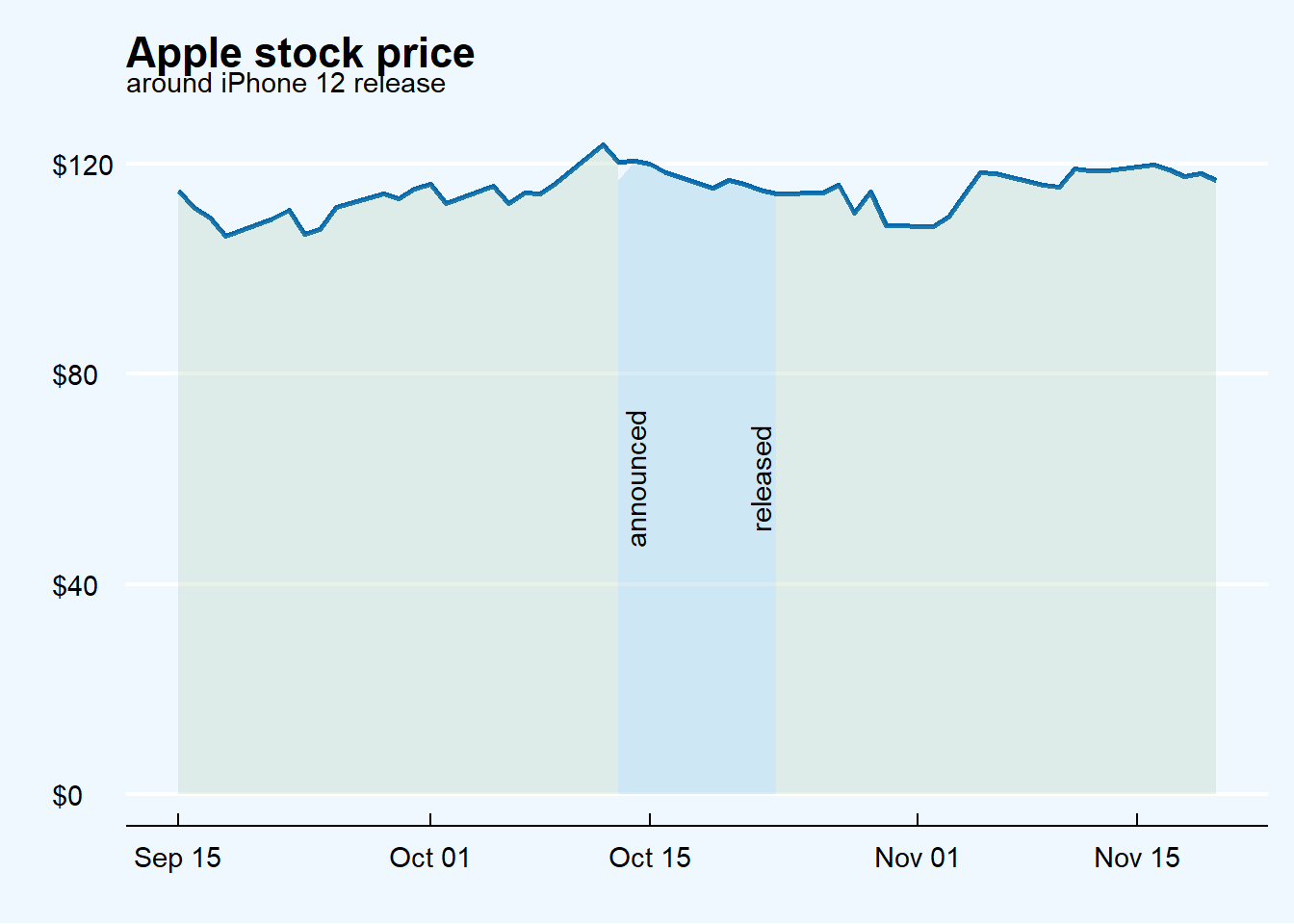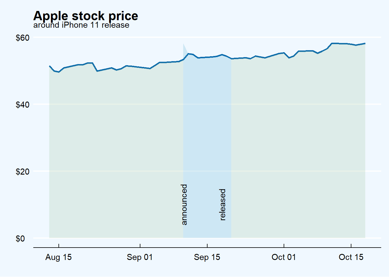 evaluating visually the iPhone new model launch effect on Apple stock price;