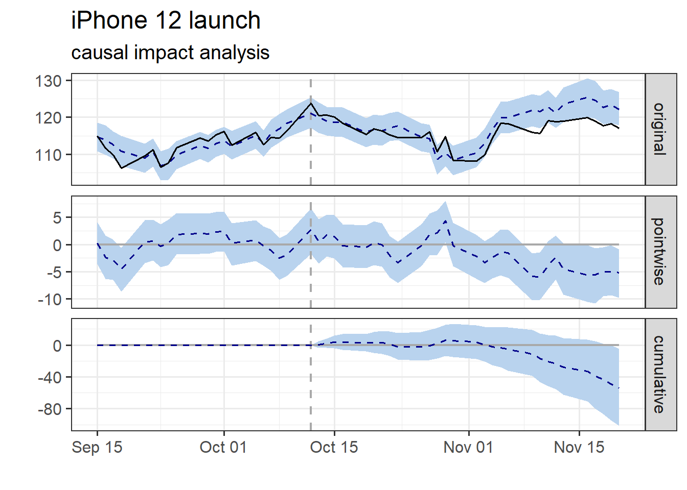 During the post-intervention period, the Apple share price had an average value of approx. 116.26 dollars. By contrast, in the absence of an iPhone 12 launch, we would have expected an average share price of 118.13. The 95% interval of this counterfactual prediction is [116.44, 119.85]. Subtracting this prediction from the observed share price yields an estimate of the causal effect the iPhone 12 launch had on the Apple share price. This effect is -1.86 with a 95% interval of [-3.59, -0.17].
