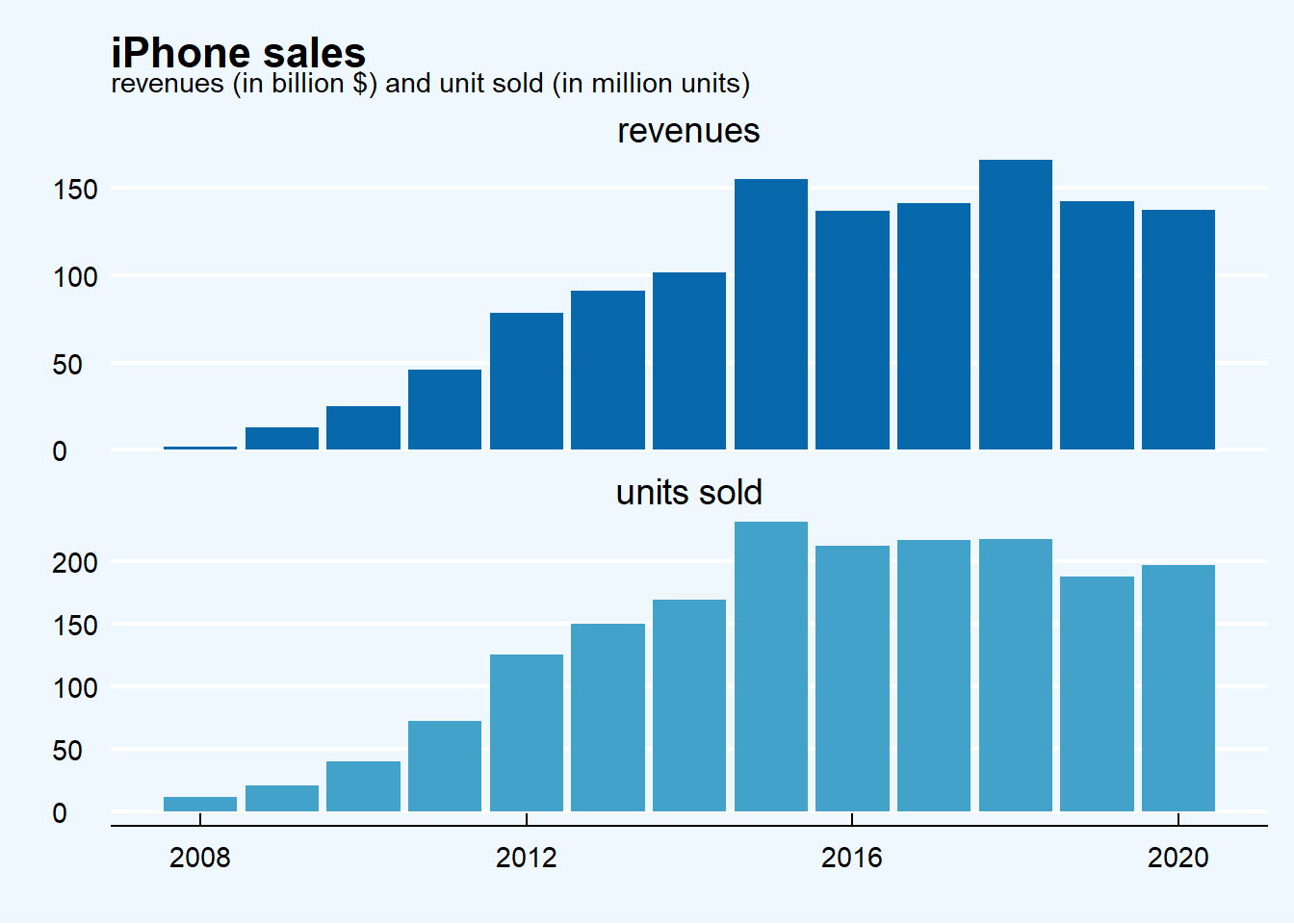 The importance of the iPhone for Apple can be further explored by looking at yearly sales from 2008 both in terms of revenues and of devices sold.