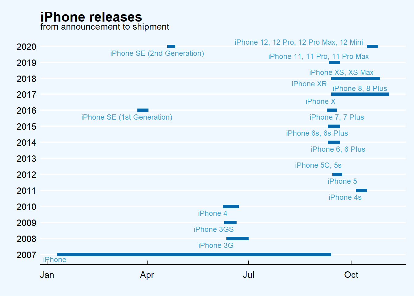Throughout its history, since 2007, there have been 18 launches of new iPhone models or model lines. The chart below shows each launch indicating the interval between the date of the commercial announcement and the actual availability of the model on the market.