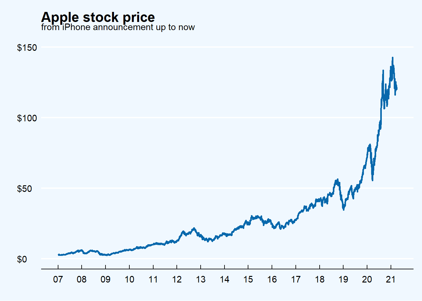 The trend in Apple’s stock price since the announcement of the first iPhone is a growth story well described by an overall line chart.