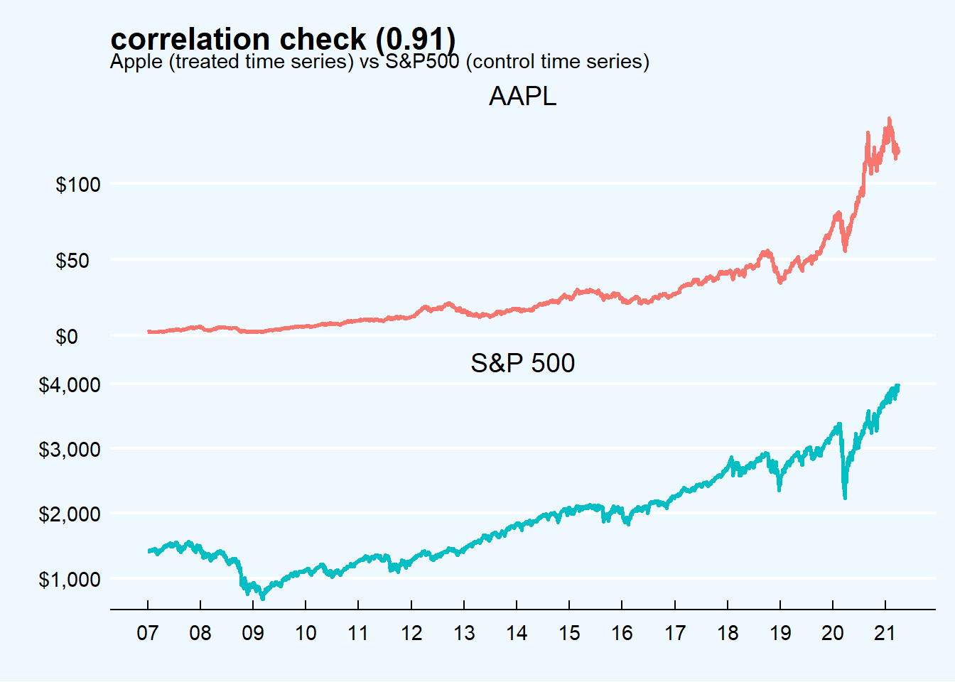 the relationship between control (S&P500 Index) and historical series traded (Apple share price), as established in the pre-period, remains stable throughout the post-period.