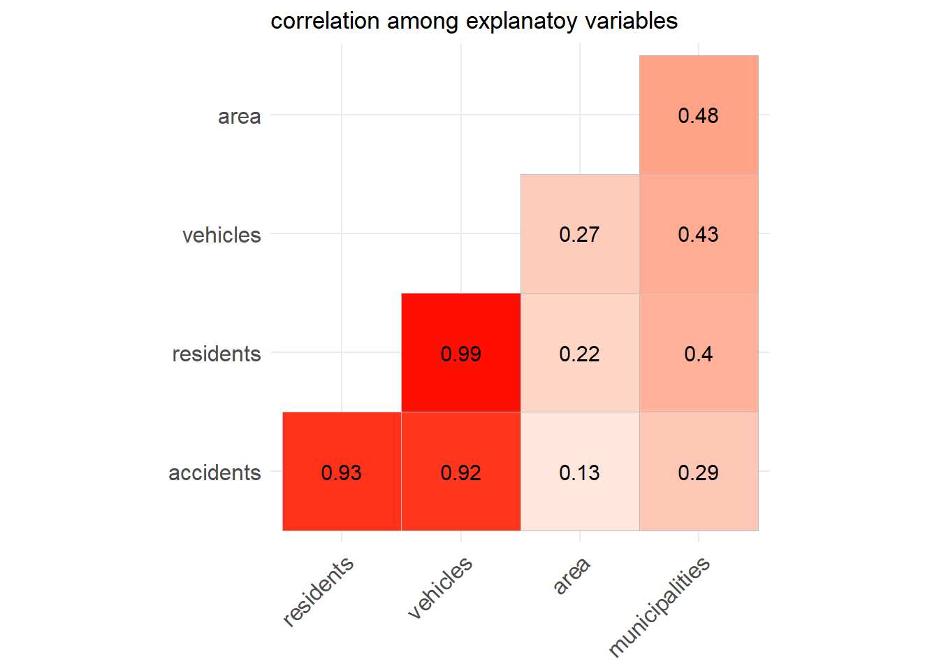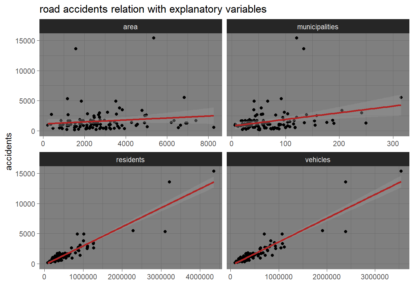 The first approach is to adapt a global linear model that captures the association of accidents with structural differences between districts. The higher frequency of road accidents is reasonably associated with the resident population, registered vehicles, the number of municipalities within a district and the area of the district.