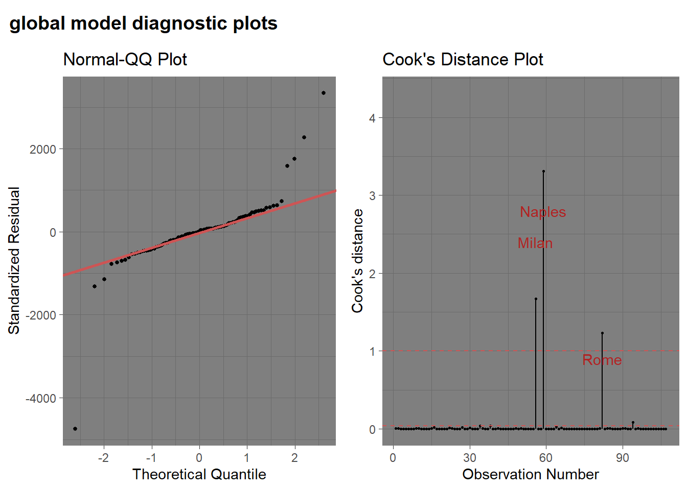 the Cooks Distance plot indicates the presence of at least 3 districts (Naples, Milan and Rome) that can have too much influence in determining the model parameters.