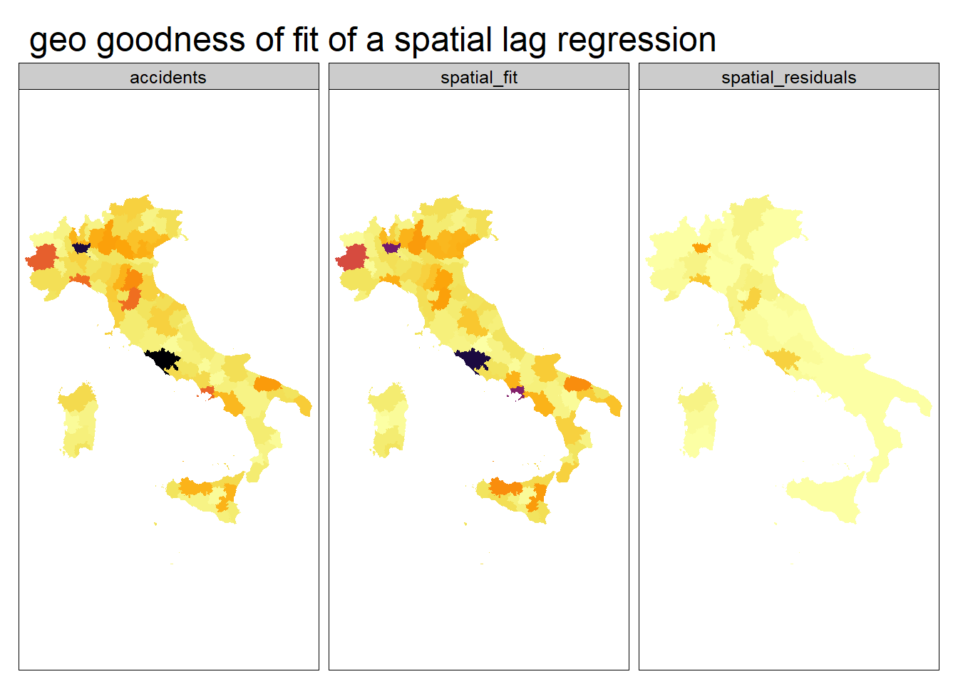 The goodness of fit related to the geography can be analyzed visualizing the actual geo distribution of the accidents against the fitted value by the global model together with the geo distribution of the residuals.