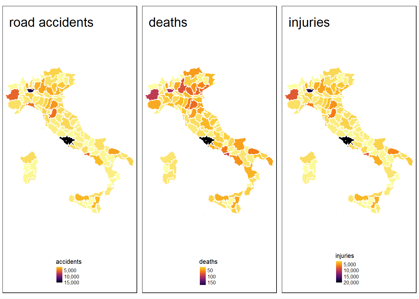 With the help of a choropleth map, it is possible to identify where in Italy the road accidents occur the most.