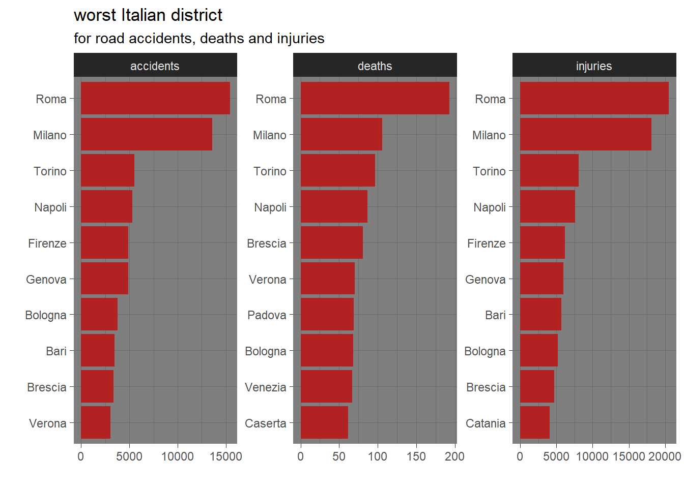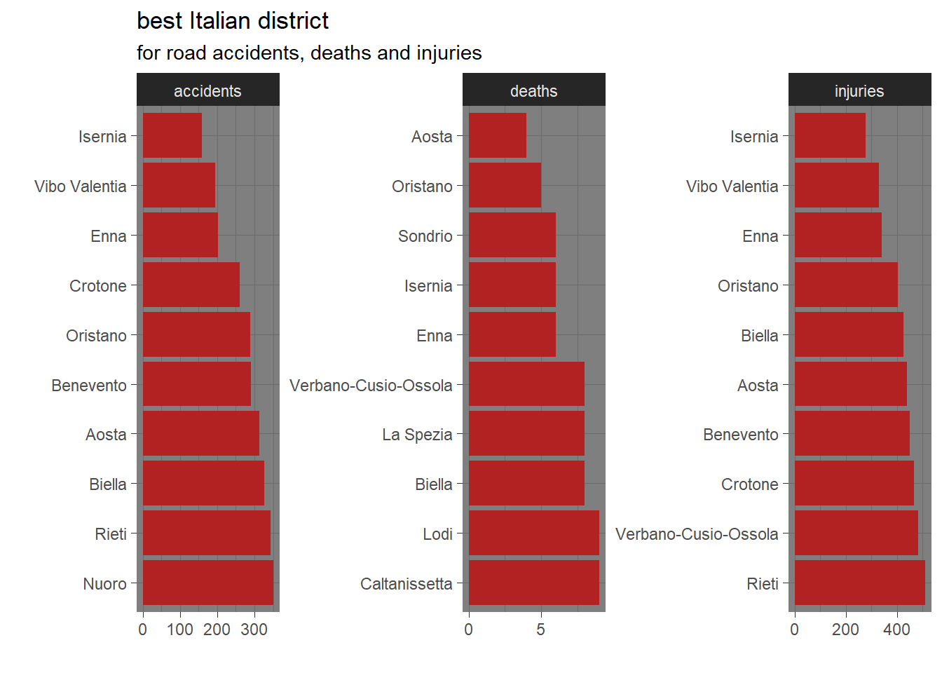 The district counting less road accidents is Isernia in the south of Italy that is also the less populated ditrict in Italy. Also Vibo Valentia, Crotone, Benevento are located in the south. Oristano, Nuoro, Enna are districts in the big islands territory of Sardinia and Sicily. Aosta and Biella are in the north of Italy while Rieti is in the center of Italy. Aosta had the least number of deaths related to road accidents perhaps due to the mountainous conformation of its territory.