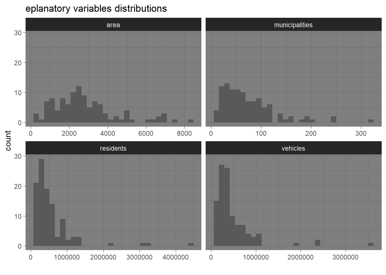 Some problems about this model have been already highlighted such as the right skewed distribution of the dependent variable due to actual data for metropolitan areas or the high correlation between residents and vehicles variables managed by using only residents as explanatory variable.